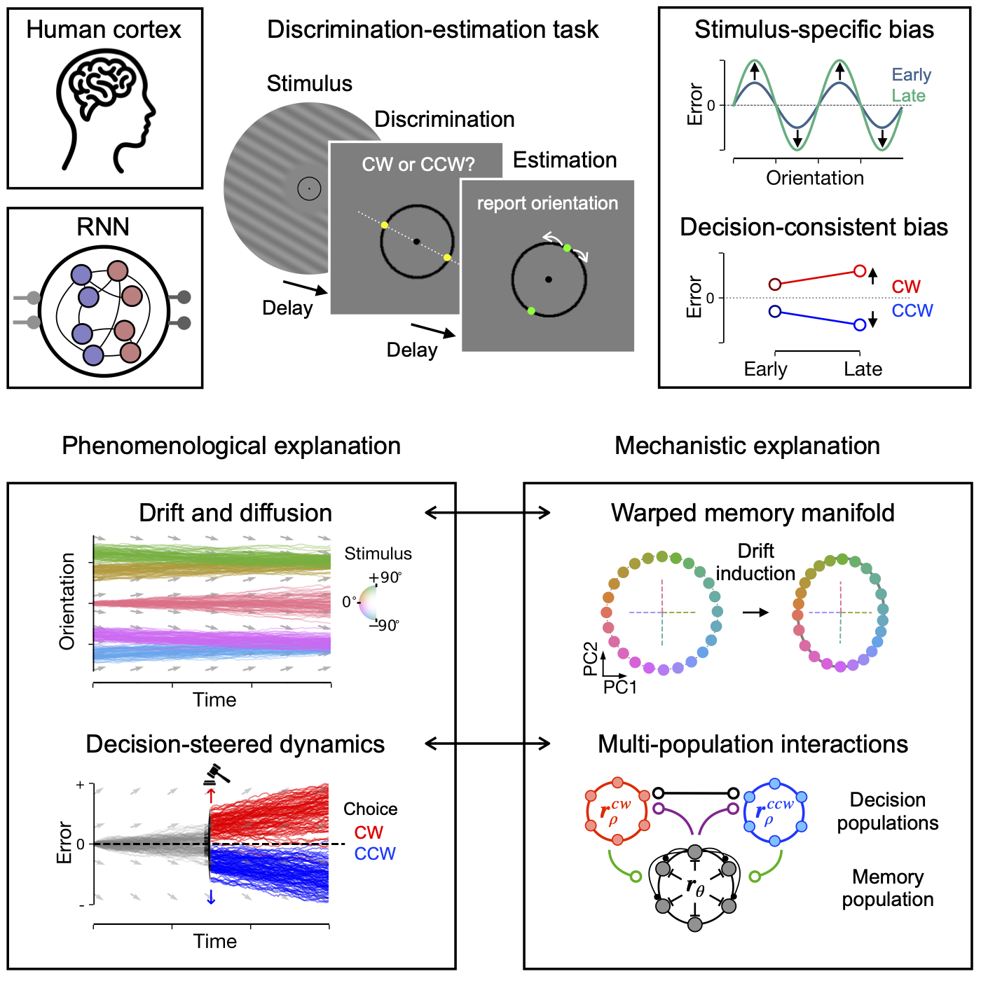 Perception is not a perfect mirror of the world. It is shaped by systematic biases that often reveal how our sensory systems efficiently encode the statistics of natural environments. In this line of work, I study how perception is influenced by these biases by parameterizing stimulus spaces and tracking behavioral and neural responses over time. We found that intrinsic attractor dynamics pull representations in the visual cortex (decoded from fMRI) toward stable states, and recurrent neural networks trained with task constraints reproduced similar behavioral biases (Gu et al., 2025; see also the Preview by Luo & Pascucci, 2025). We are following up with a study on the circuit mechanisms of decision-consistent biases. Recently, I have extended this framework to natural images, examining how human biases reflect the multidimensional statistical structure of natural scenes.